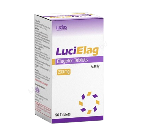 LuciElag (Elagolix), generic Orilissa, is a prescription medicine used to treat of moderate to severe pain associated with Endometriosis and is also used (in combination with hormones) to manage heavy menstrual bleeding caused by Uterine fibroids in premenopausal women; it works by suppressing ovarian hormone production, particularly estrogen, to reduce symptoms.